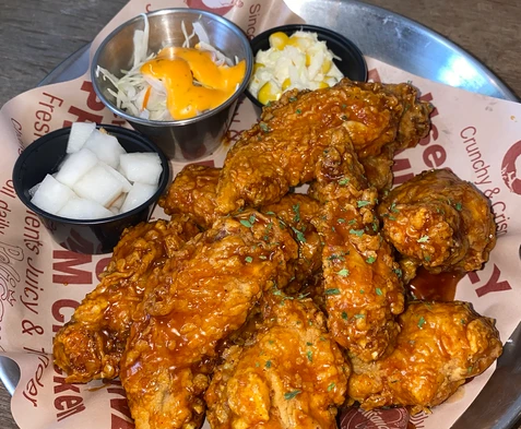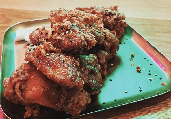 The wings here are battered with potato starch, fried on low and then a second time on high to bring on extra crisp. They come in six different flavors including Soy Garlic, Korean Sweet Gochujang, Hot Honey, Nashville Hot, Sweet Black Pepper Soy or even get them non-sauced Original. The restaurant has a Bon Chon feel to it with indoor and outdoor seating and also serves alcohol.